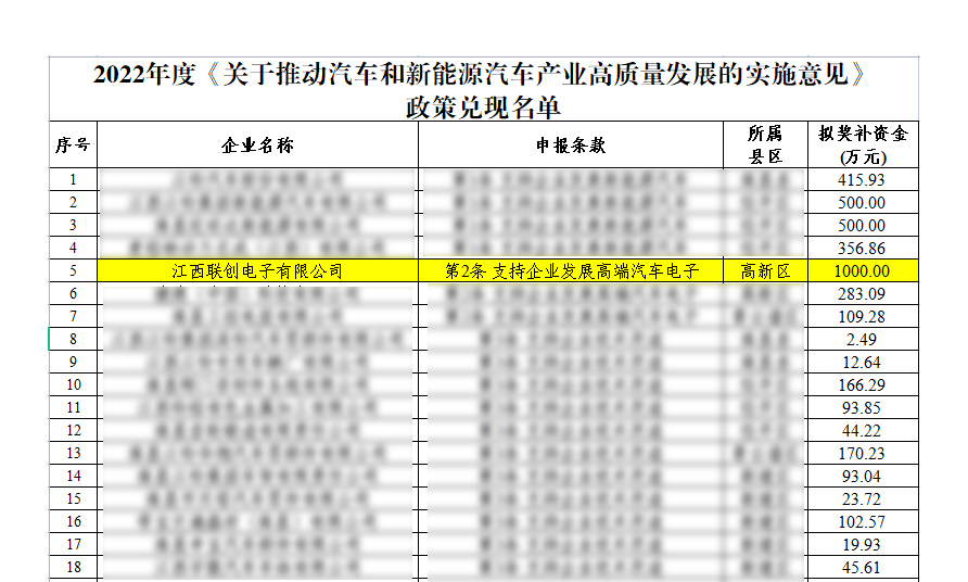 为抢抓新一轮新能源汽车产业发展机遇,加快建设具有南昌特色的现代化产业体系,2023年12月,2022年度《关于推动汽车和新能源汽车产业高质量发展的实施意见》政策拟兑现名单公示,江西星空网页版登录入口有限公司榜上有名,获得发展高端汽车电子1000万元奖补资金,成为南昌市唯一一家获顶额奖补的企业。